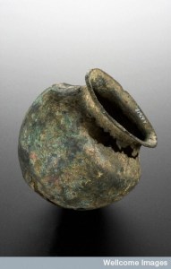 Cupping is the practice of placing heated cups or vessels like this on the body. It is believed to draw out any impurities and bring blood to the surface of the skin. This is known as dry cupping. Wet cupping is when the welts left on the body are cut to let blood flow out. It was believed that this would re-balance the humours and restore a person to health. This cupping vessel was excavated at an archaeological dig in Syracuse, Sicily, in 1926. Archaeological digs were one of Henry Wellcomes obsessions.